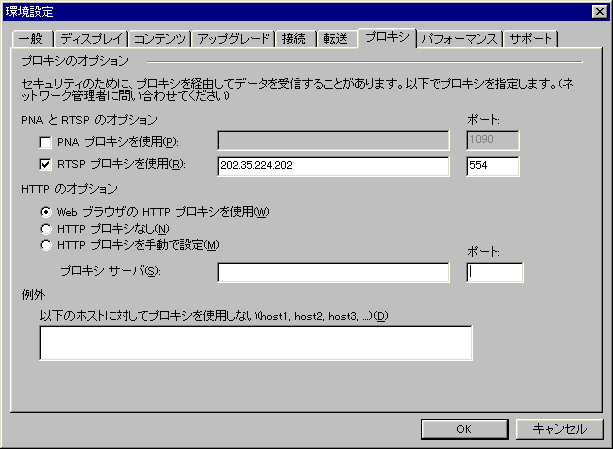 し、さらに「RTSP」の「プロキシアドレス」に「202.35.224.202」を入力し、